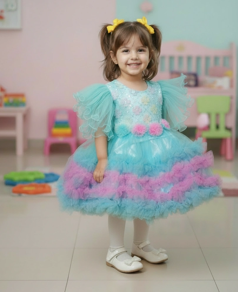 - Design and Style: It is a vibrant, multi-colored party dress with a tutu style. The design is typically handmade and features a layered, swirled gown appearance with a color gradient from pale turquoise to light pink.
